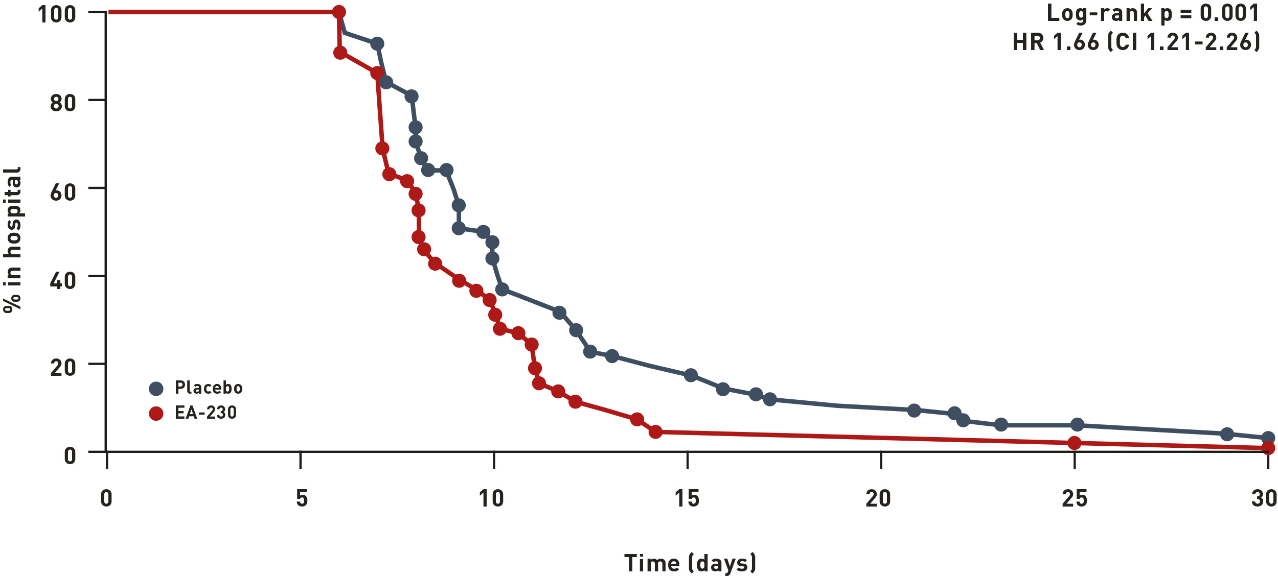To evaluate its use in major surgery, an intravenous solution of EA-230 was given to patients during cardiac surgery comprising Coronary Artery Bypass Grafting (CABG) and valve replacement. Length-of-stay in the hospital of EA-230-treated patients was significantly reduced compared to LoS of placebo-treated patients (see image above). Placebo patients required 2.5 times longer duration of treatment dependent postoperative complications (p=0.0026) and demonstrated 25% longer length-of-stay (p=0.001) than EA-230 patients.